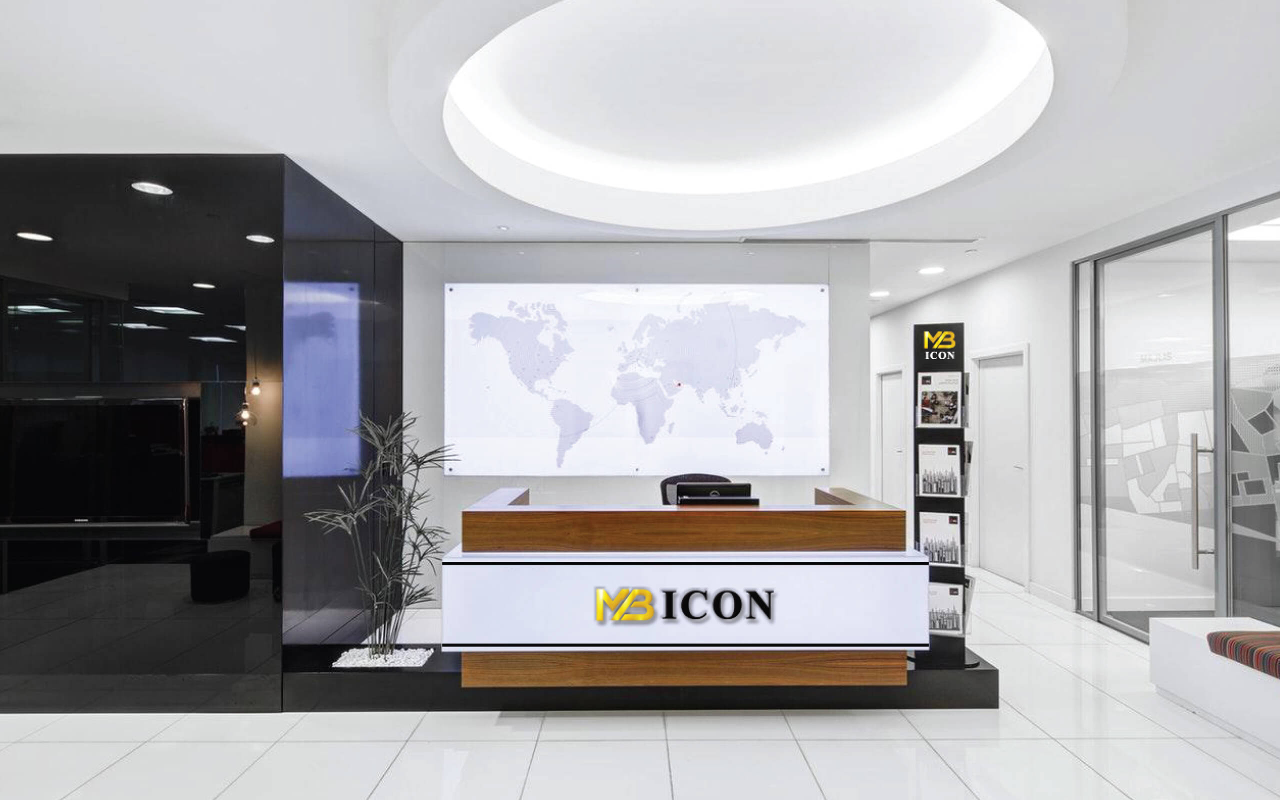 The lobby of the Mb Icon Building captivates guests with its sophisticated design, blending contemporary aesthetics with inviting elements that create an atmosphere of warmth and distinction.
